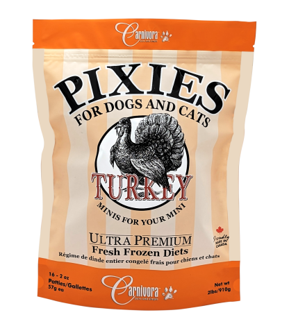 Contains finely ground whole turkey carcass. Whole turkey patties contain the entire bird except the head, feet, feathers and intestines. All the bones are grindable so bone content in turkey is higher than patties made from larger animals (only a small percentage of bones in larger animals like goat, lamb, bison and beef are grindable). Organs make up approximately 8% of the patty - this includes lungs, liver, heart and kidneys. On average over all our protiens, patties are composed of 66% muscle meat, 7% bone, 10% organs, 7% blood and 10% fat. We DO NOT add anything to our foods. You may supplement as needed. Please visit our healthcare and supplement product pages.